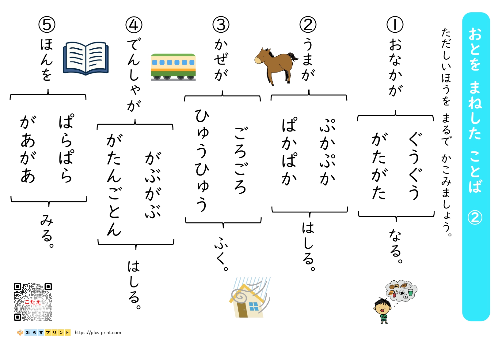 幼児~小学校低学年のお子さまを対象にした「オノマトペ(擬音語・擬態語)の練習」用無料プリントです。