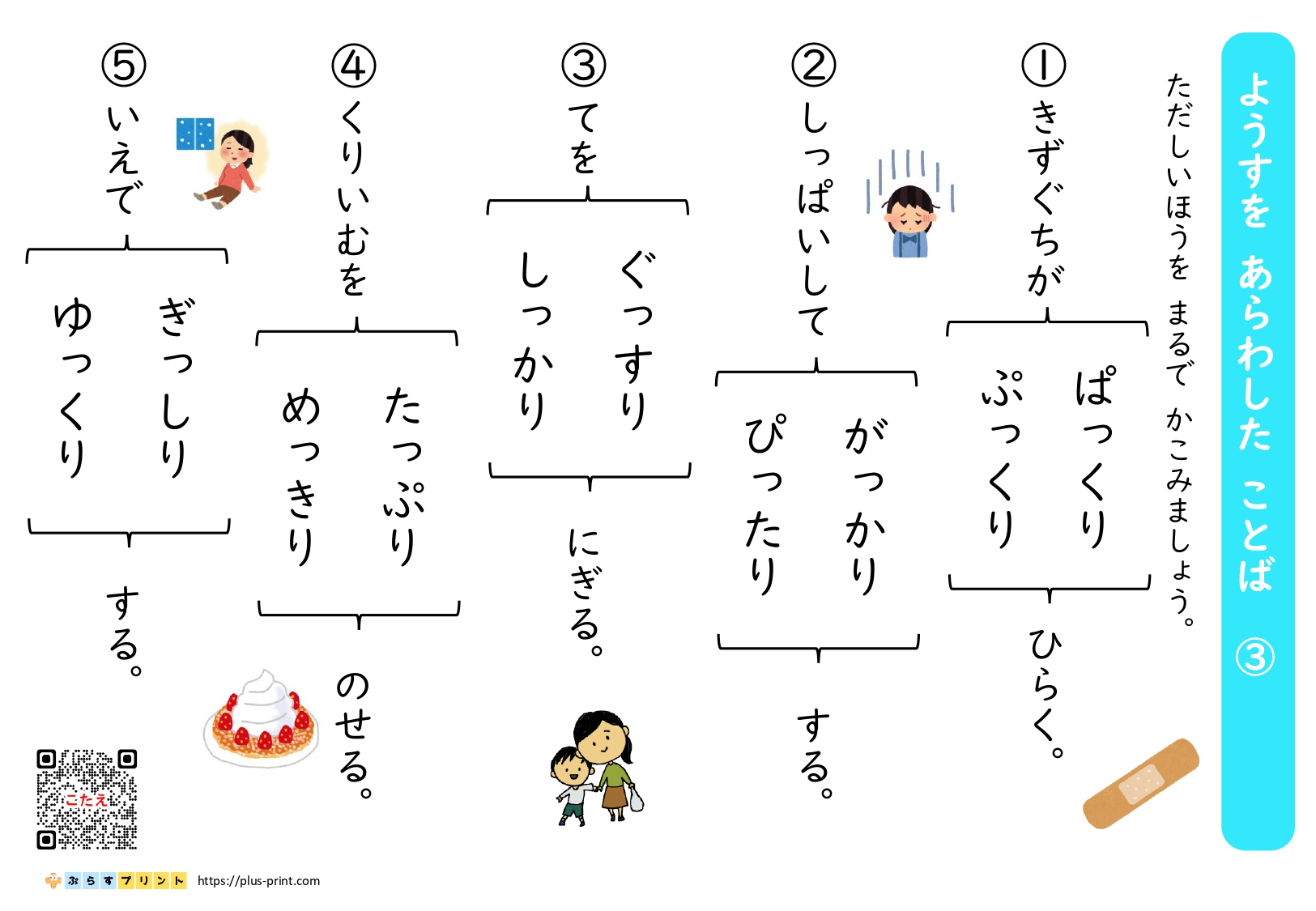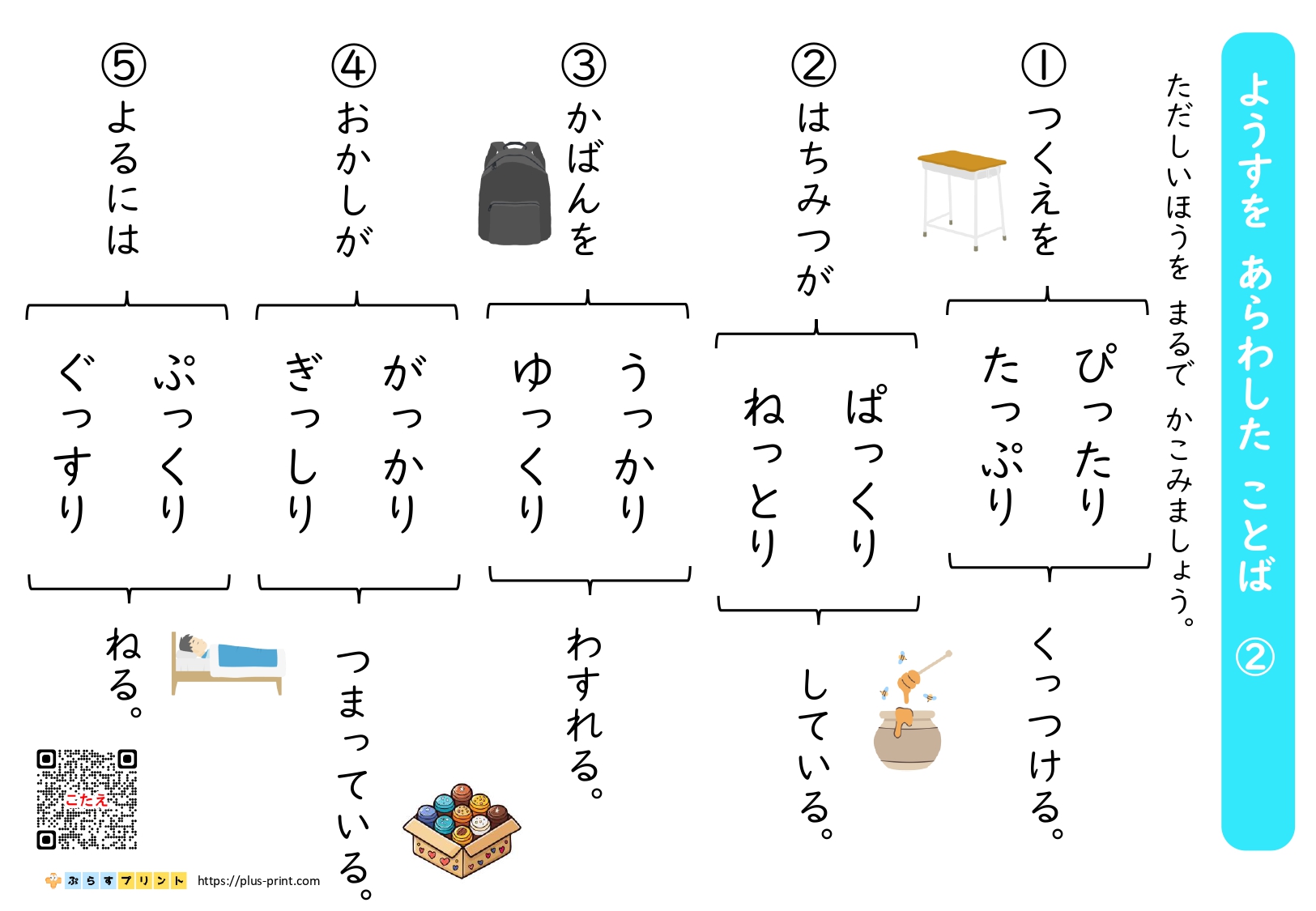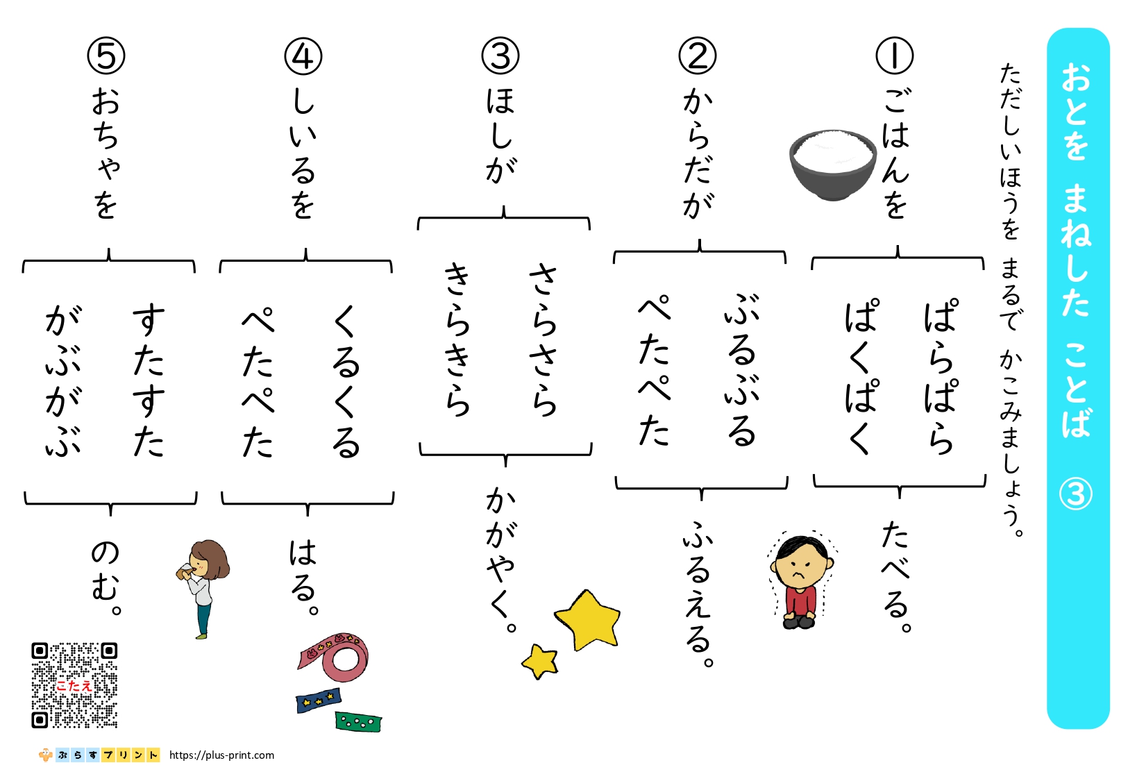 そこで、身近な場面とイラストを使いながら、オノマトペを楽しく学べるプリントを作りました。